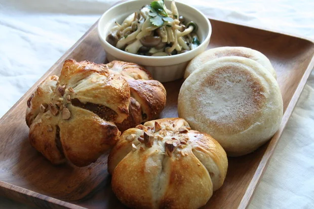 プレーンのマフィンはサンドイッチに最適、オーブンに入れるコツも盛りだくさんです。いちじくのお花の形をしたパンはなんとも愛らしく、どなたでも笑顔になれる見た目とお味です。また、きのこをいっぱい使った酵母液マリネも。パンだけではもったいない、美味しい酵母液ができたら是非作ってみてくださいね。
