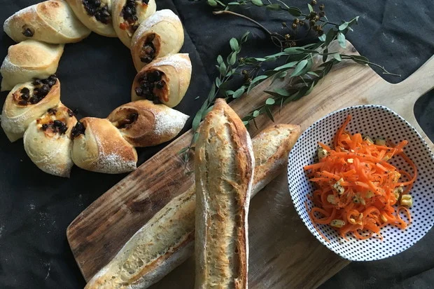 一品目はライ麦を少し加えた生地を細長く成形しクープを一本入れて。サンドイッチにも最適な大きさです。二品目はバレンタインということもありチョコチップを巻き込んだリースパン。オレンジ、マンゴーも入れて華やかに仕上げます。酵母液を使ったキャロットラペもおすすめです。