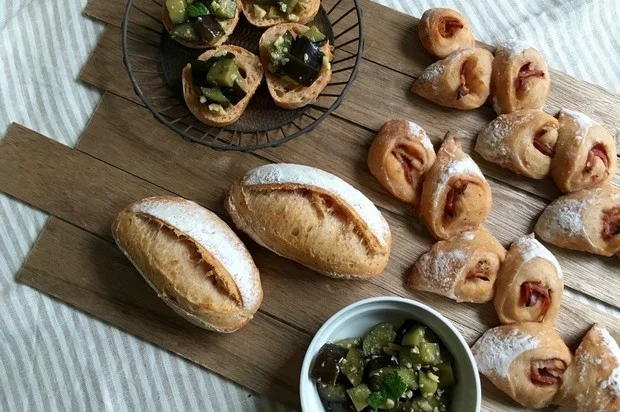 夏に爽やかなトマトベースの生地で二種類のパンです。同じ生地を使い、ベーコンエピ、そしてナスのマリネに合うシンプルなパンをご紹介します。ナスのコロコロマリネは酵母を使用します。酵母のほんのり優しい甘さはトマト生地のパンにピッタリです。