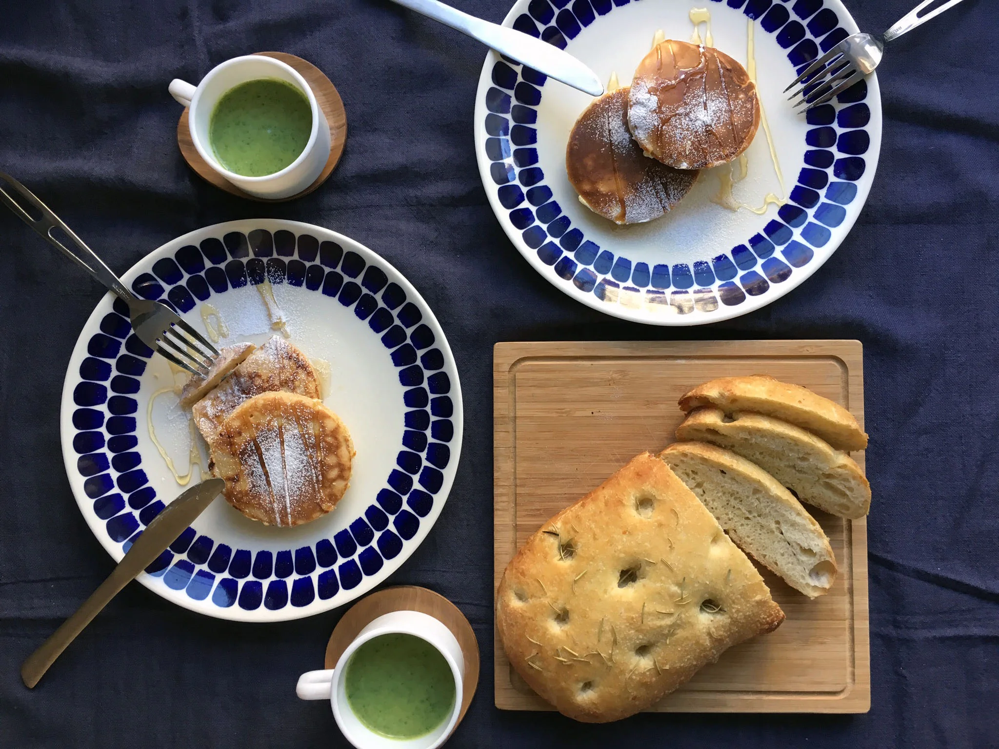 一品目はマッシュした産地直送の美味しいじゃがいもを練りこんだフォカッチャ。大きく成形しふんわり、翌日はしっとり。二品目は手軽に焼けるもっちりパンケーキ。夜に仕込んでおいて朝焼ける、どこか懐かしい素朴なしっとりパンケーキです。